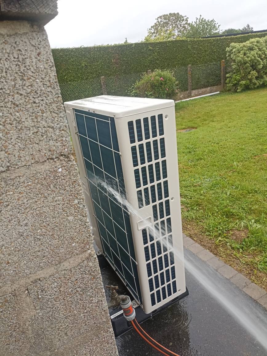Le groupe extérieur de votre pompe à chaleur air-eau est continuellement exposé à la pollution, aux intempéries et aux débris végétaux. Pour garantir son bon fonctionnement, il est crucial de le nettoyer régulièrement en retirant poussière, feuilles, insectes et autres salissures qui peuvent bloquer les ailettes de l'échangeur.